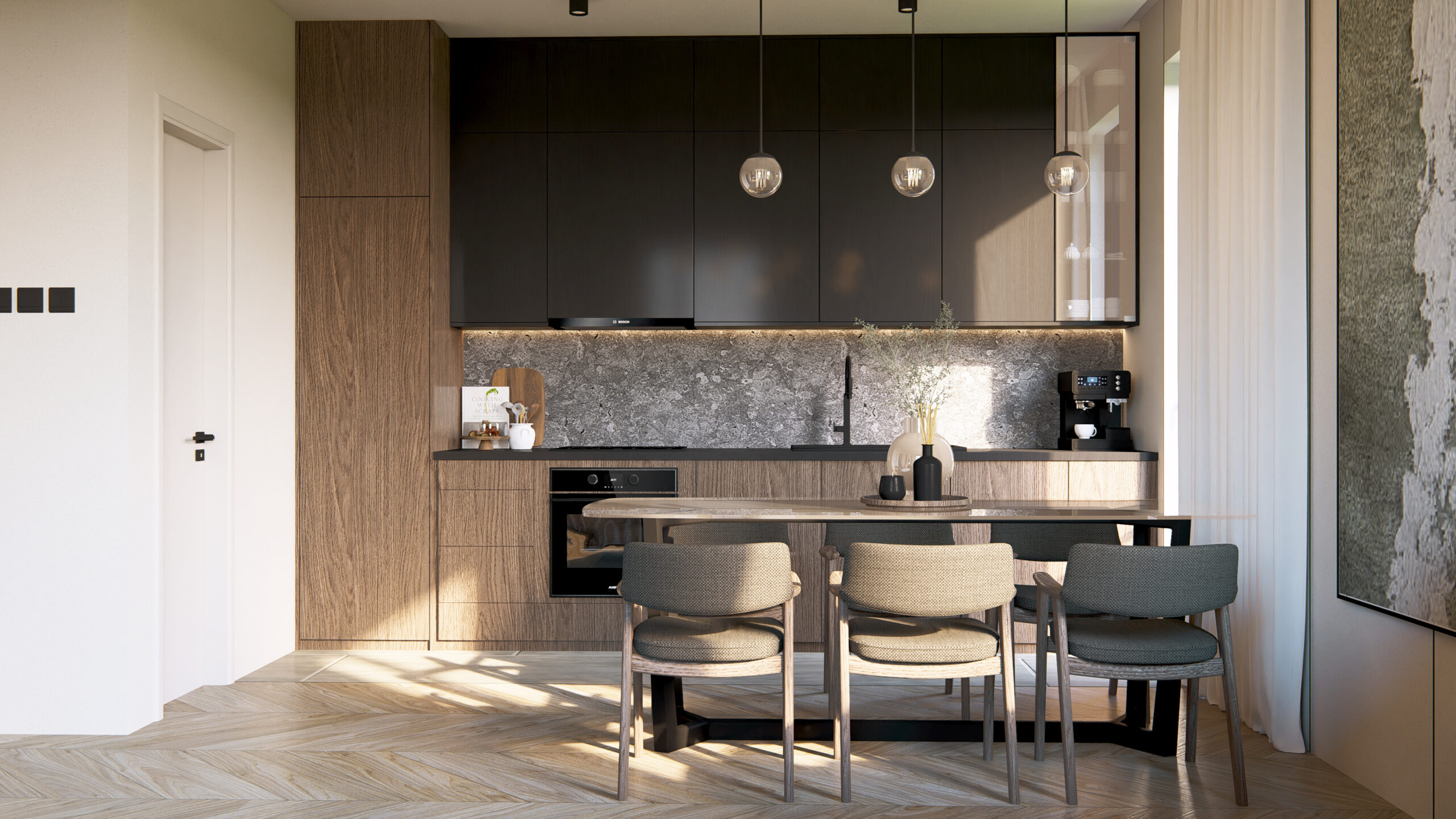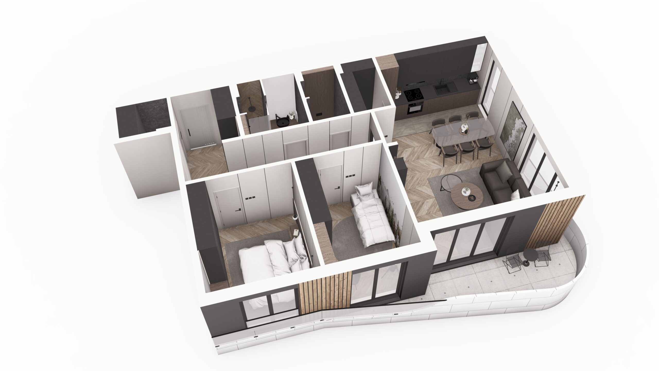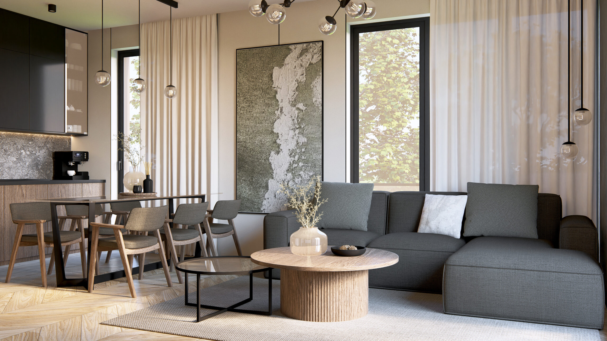 Ovaj stan je pažljivo osmišljen tako da pruži maksimalnu funkcionalnost i udobnost, uz savremen dizajn koji kombinuje prirodne tonove, moderan nameštaj i obilje svetlosti. Dnevna soba, trpezarija i kuhinja povezani su u otvoren koncept koji stvara prostran i prijatan ambijent — savršen za porodična okupljanja i svakodnevne rituale. Kuhinja je izvedena u tamnim tonovima, sa modernim elementima koji daju ozbiljnost i eleganciju prostoru. Velika trpezarija omogućava prijatna druženja, a zahvaljujući velikim prozorima, čitav dnevni deo je ispunjen prirodnom svetlošću. Glavna spavaća soba je mirna i uvučena, sa modernim ugradnim plakarima koji omogućavaju savršenu organizaciju. Druga soba, jednako svetla i funkcionalna, može biti dečija soba, radni prostor ili multifunkcionalna soba. Stan poseduje praktično organizovano kupatilo sa modernom sanitarnom opremom i kombinacijom tamnih detalja i toplog drveta, što stvara prijatnu, hotelsku atmosferu. Jedan od najvećih aduta ovog doma je dugačka lođa koja prati ceo dnevni prostor. Ona stanu daje urban, moderan karakter i pruža idealan kutak za jutarnju kafu, rad na laptopu ili opuštanje na svežem vazduhu. Uz savršeno izbalansirane zone privatnosti i zajedničkog prostora, ovaj stan predstavlja idealnu opciju za savremen život.